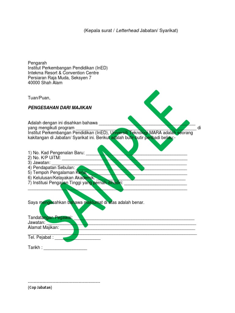 Contoh Surat Akuan Bujang Dari Majikan Download Kumpulan Gambar from imgv2-2-f.scribdassets.com Contoh surat dinas lengkap, bisa untuk sekolah, perusahaan, karyawan, pemerintah, swasta dan lain sebagainya. Dengan berbagai contoh surat yang telah banyak akan membantu kamu untuk mengetahui contoh surat resmi yang format penulisan surat resmi. Jika anda berada dalam perkongsian, pastikan semua rakan. Kepala surat atau kop surat. Contoh surat undangan resmi perusahaan. Cuma anda masih lagi tak berani nak berhenti kerja. Contoh surat izin tidak masuk sekolah. Contoh format surat pengesahan majikan.
