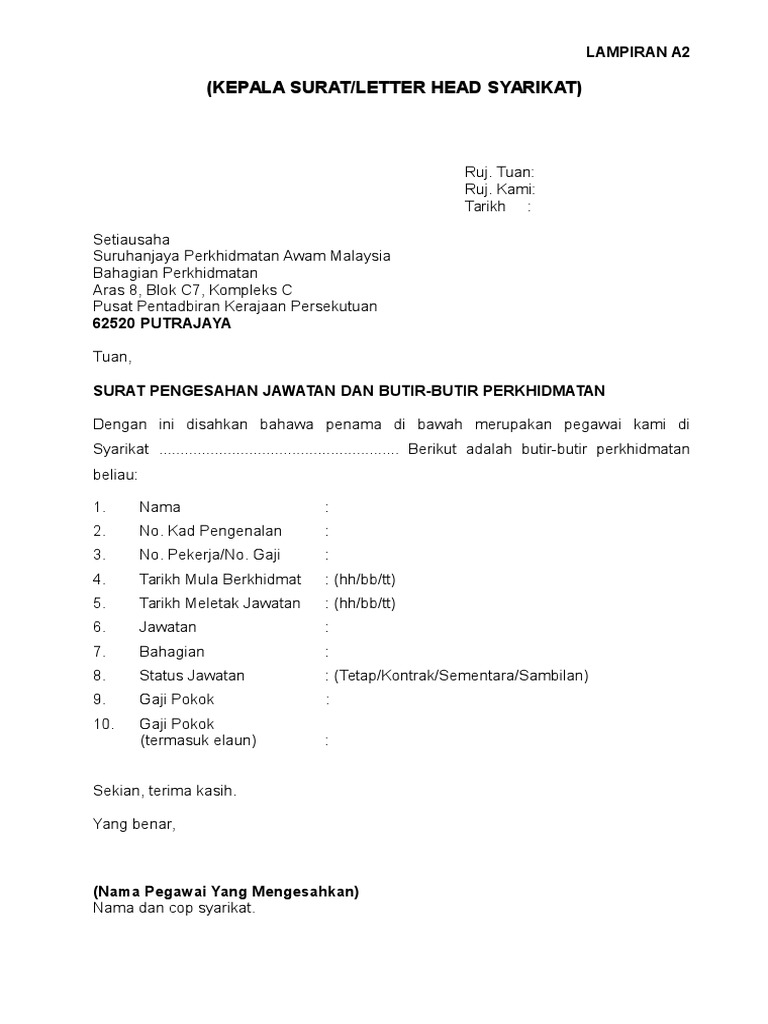 Kepala surat terletak di bagian atas dan menjadi poin penting sebuah surat. Dengan berbagai contoh surat yang telah banyak akan membantu kamu untuk mengetahui contoh surat resmi yang format penulisan surat resmi. Contoh kop surat atau kepala surat adalah bagian teratas pada sebuah lembaran surat. Nah kali ini kami akan berbagi mengenai contoh surat jalan pengiriman barang, kendaraan, barang keluar, tugas, alat berat, dinas, desa. Lampiran 2 contoh format surat pengesahan majikan kepala surat (syarikat) no rujukan :