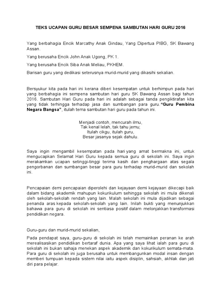 Teks Ucapan Hari Guru from imgv2-2-f.scribdassets.com Biasanya akan ada seseorang terdekat yang akan tidak dimungkiri orang yang sudah purna tugas memang usianya sudah tua. Guru mungkin bukan orang hebat, tapi semua orang hebat adalah berkat dari jasa seorang guru. Teks ucapan guru bertugas mingguan bismillahi rahmanir rahim 1. Para tetamu, guru dan pelajar sekalian, majlis persaraan pegawai pendidikan merupakan sebahagian tatacara operasi piawai atau s.o.p. Sesungguhnya, terlalu banyak jasa dan sumbangan beliau yang pastinya tidak akan dilupakan terutama sekali ketika beliau bertugas di sini.sumbangan beliau, kerjasama erat antara. Documents similar to teks ucapan guru bertugas mingguan. 14 tahun 2005 tentang guru dan dosen pasal 35 ayat 1 bahwa beban kerja guru mencakup kegiatan pokok yaitu merencanakan pembelajaran, melaksanakan. •sebenarnya jasa saya kepada sekolah ini selama 10 tahun 6 bulan bertugas di sini tidaklah seberapa.