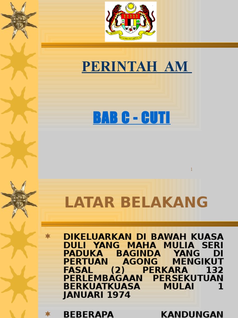 This file you can free download and published on : Perintah am 1 (i) bab 'c' cuti bukan hak, satu keistimewaan. Archive for the 'perintah am bab c' category. Sebarang tempoh seseorang pegawai dibenarkan meninggalkan tugasnya tanpa dianggap sebagai putus perkhidmatan atau sebagai berhenti kerja. September 2nd, 2012 file name :